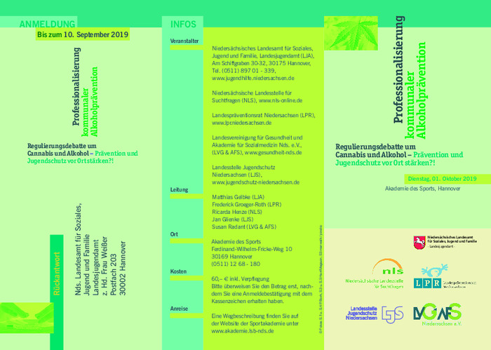 Das Niedersächsische Landesjugendamt (NLJA), die Niedersächsische Landesstelle für Suchtfragen (NLS), die Landesstelle Jugendschutz Niedersachsen e.V. (LJS), die Landesvereinigung für Gesundheit / Akademie für Sozialmedizin Niedersachsen Bremen e.V. (LVG&AfS) und der Landespräventionsrat Niedersachsen (LPR) führen gemeinsam eine Veranstaltungsreihe zum Thema "Professionalisierung kommunaler Alkoholprävention" durch.