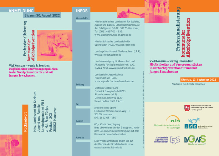 Das Niedersächsische Landesjugendamt (NLJA), die Niedersächsische Landesstelle für Suchtfragen (NLS), die Landesstelle Jugendschutz Niedersachsen e.V. (LJS), die Landesvereinigung für Gesundheit / Akademie für Sozialmedizin Niedersachsen Bremen e.V. (LVG&AfS) und der Landespräventionsrat Niedersachsen (LPR) führen gemeinsam eine Veranstaltungsreihe zum Thema "Professionalisierung kommunaler Alkoholprävention" durch.